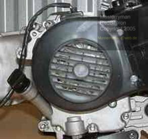 Anschliessend das Lüftergehäuse auf der rechten Motorseite ebenfalls abbauen (8 mm Schlüs-sel, günstig eine Ratsche mit kurzer Verlängerung).