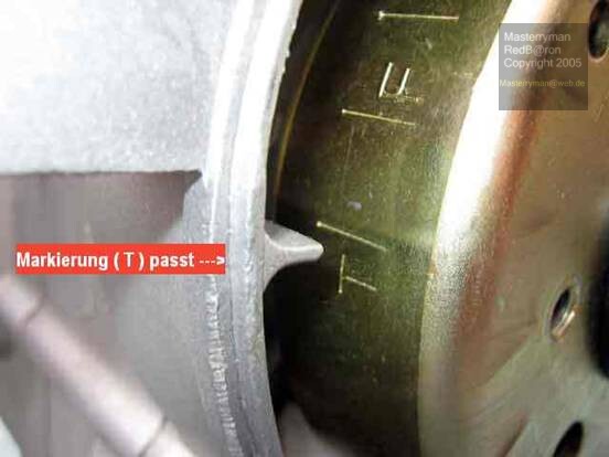Dazu dreht man am Lüfterrad, bis die Markierung „T“ auf dem metallenem Lichtmaschinen-Rotor (unter dem Lüfterrad)