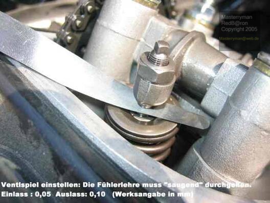 Das korrekte Ventilspiel ist 0,05 mm für das Einlass-, 0,10 mm für das Auslassventil.